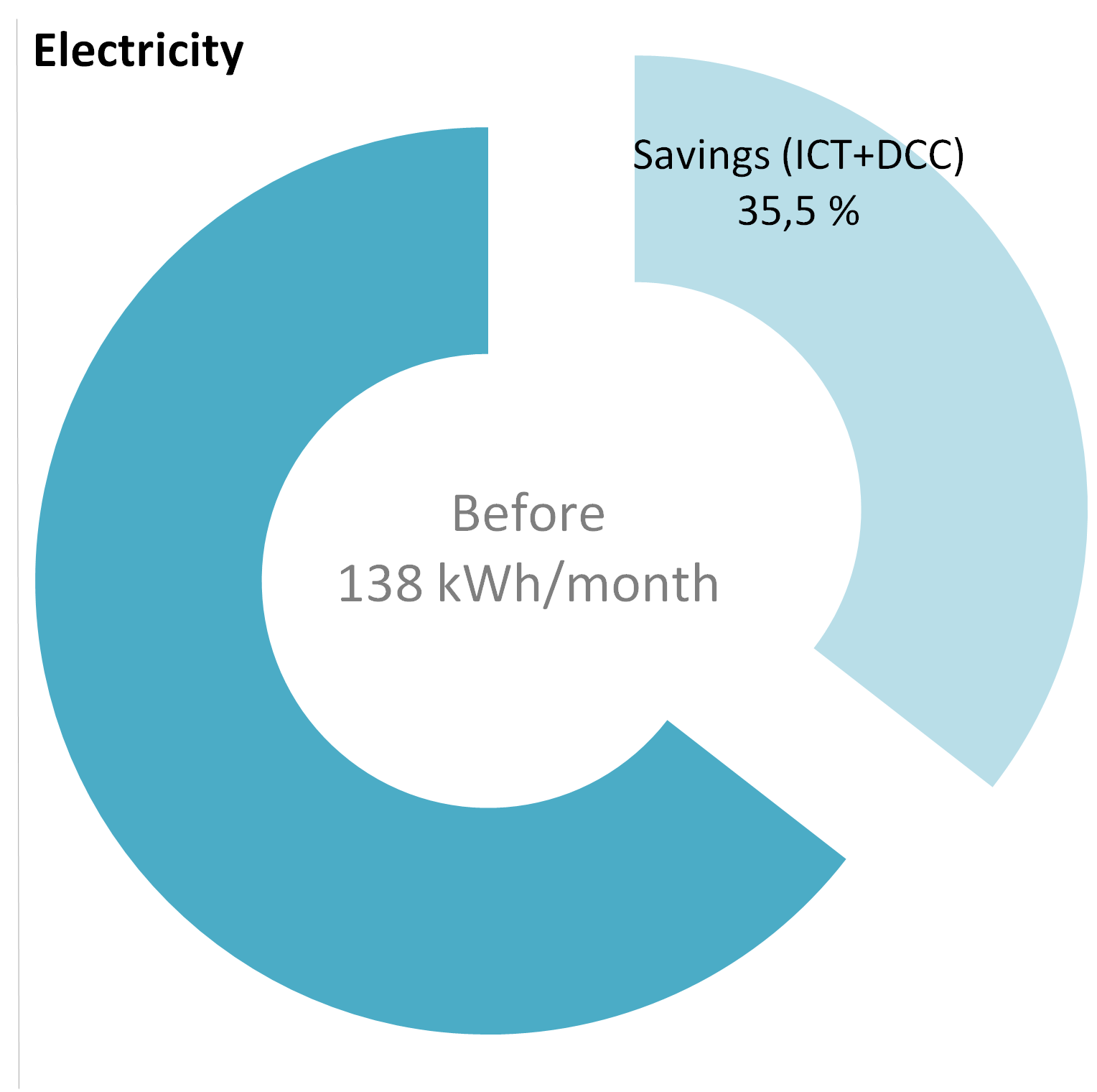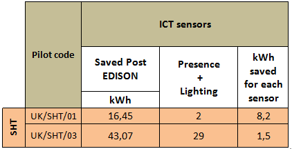 In the two pilots (SHT 01, SHT 03) are operative 31 ICT components (sensors) to contribute to the energy saving. The table below reports the number, typology of sensors and in particular the estimated amount of average 8.2 and 1.5 kWh saved, on monthly base, by each sensor.