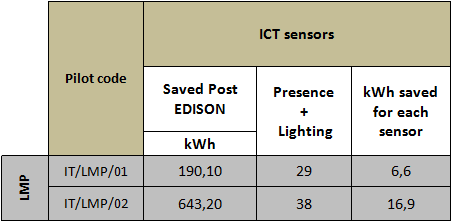 In the two pilots (lmp 01 and lmp 02) are operative 67 ICT components (sensors) to contribute to the energy saving. The table below reports the number, typology of sensors and in particular the estimated amount of average 6.6 and 16.9 kWh saved, on monthly base, by each sensor.