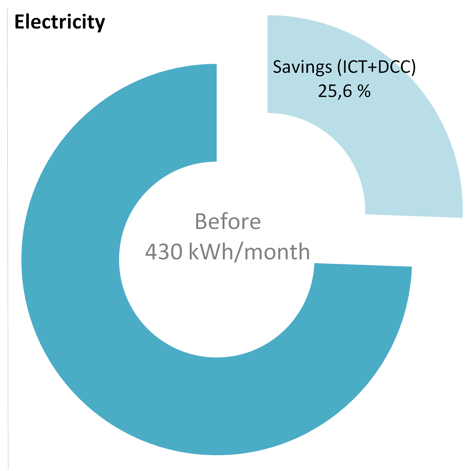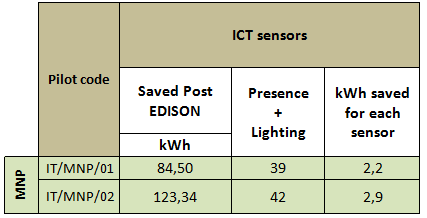 In the two pilots (mnp 01 and mnp 02) are operative 81 ICT components (sensors) to contribute to the energy saving. The table below reports the number, typology of sensors and in particular the estimated amount of average 2.2 and 2.9 kWh, on monthly base, by each sensor.