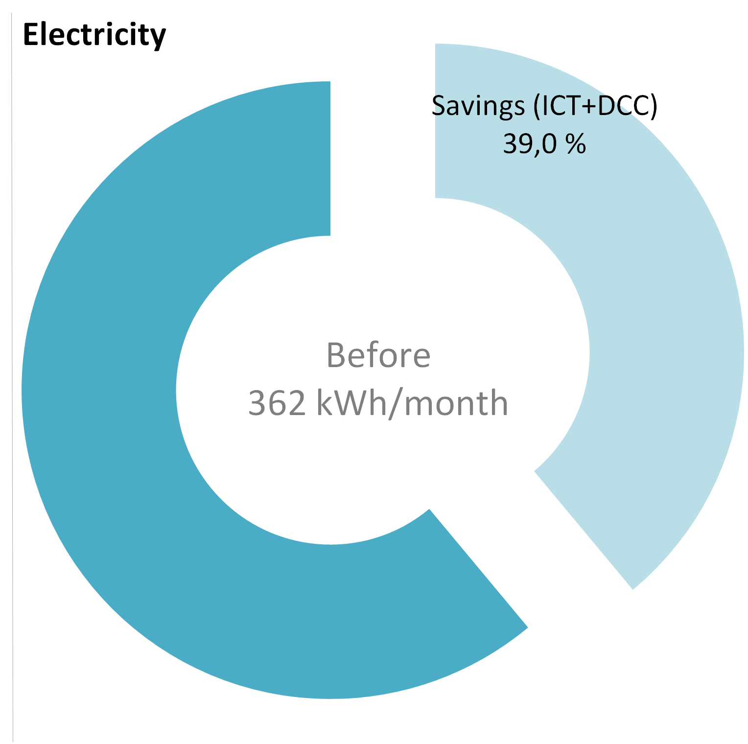 In this exposition building pilot are operative 9 ICT components (sensors) to contribute to the energy saving. The table below reports the number, typology of sensors and in particular the estimated amount of average saved of 13.7 kWh, on monthly base, by each sensor.