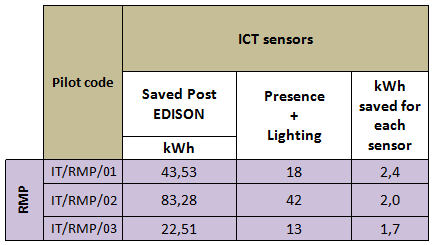 In the three pilots (rmp 01, rmp 02 and rmp 03) are operative 73 ICT components (sensors) to contribute to the energy saving. The table below reports the number, typology of sensors and in particular the estimated amount of average 2.4, 2.0 and 1.7 kWh saved, on monthly base, by each sensor.