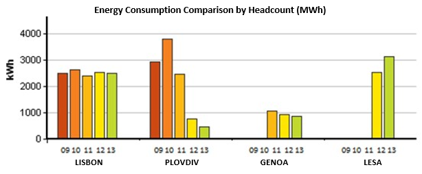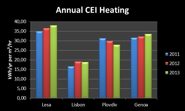 The results of this analysis show that, relative to their respective climatic burden, the buildings located in LESA and Genoa perform equally as effectively. Thus while LESA does consume more heating energy than GENOA this could be attributed to the colder weather conditions rather than it being as a result of poorer building performance. PLOVDIV by contrast shows much better performance than the other two sites relative to its climatic burden.
