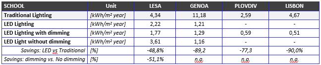 The LESA school achieved savings of 48,8% for LED versus traditional lights, and 51,1% of dimming control versus the automatic ON/OFF control based on the room occupancy. The GENOA school achieved savings of 89,2% for LED versus traditional lights. The PLOVDIV school achieved savings of 77,3% for LED versus traditional lights. The LISBON school achieved savings of 90,0% for LED versus traditional lights. For GENOA, PLOVDIV and LISBON, the dimming control can’t be evaluated versus the automatic ON/OFF control based on the room occupancy because of the non-homogeneous characteristics of the rooms.