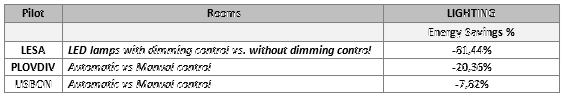 The energy savings results on Lighting consumption, mostly achieved due to the combination of the implemented Optimization Scenario: OS #27: Increase lighting efficiency; - OS #28: Set up occupancy based lighting control; OS #29: Set up dimming lighting control; OS #31: Split the electrical lighting circuits are summarized below.