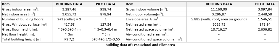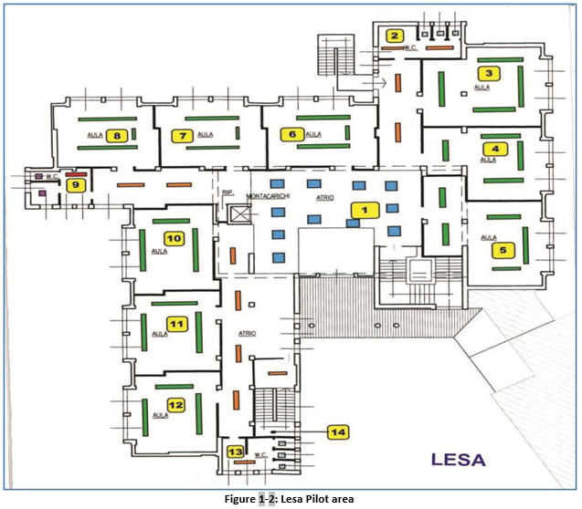 The the town of LESA is located in the Lago Maggiore region (province of Novara) in the North-West of Italy. The Elementary and Middle-grade school is a single building built in 1974 with total area of 3,056 m2 and heating volume of about 11,160 m3. It is a two story building that during the school year hosts an average of 220 people (both staff and students). The building is a typical construction of the 70s and did not have any specific energy savings provision. The Municipalty, who is the owner of the school, underwent an important restructuring plan to realize energy savings by substituting the heat generators, installing solar panels and adding insulation material specifically under the roof top. Pilot area is the first floor, and has net indoor area of 939 m2. Pilot consist of classrooms, laboratories, offices, library, lobbies, corridors and WC-s. Pilot area hosts approximately 102 people.