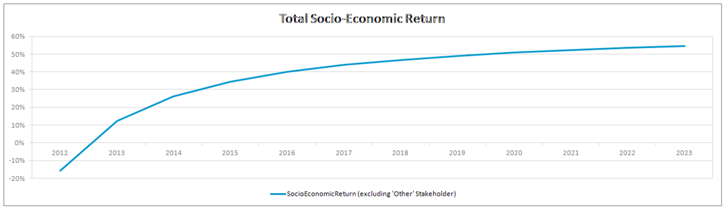 The path for socio-economic return is steeply increasing in the first years before flattening in the long run. As explained in the summary, the path for Tenants is dominated by suddenly paying for the consumption of water – different to the other pilot sites. Several monetary benefits for Tenants cannot be recorded such as avoided rent increases caused by continuously increasing consumption as well as reduction of consumption beyond reaching the “normal level”. The baseline scenario (Do-Nothing) is rather optimistic as no cost for (legally required) metering was included since the business model and equipment to be chosen by competitors is unknown. This is (in part) being compensated for by not recording the development costs (as the platform is also being used in other contexts and separating the costs was impossible). Since cost for metering is likely to be higher (also considering likely fees) the result for Social Housing is precautious.