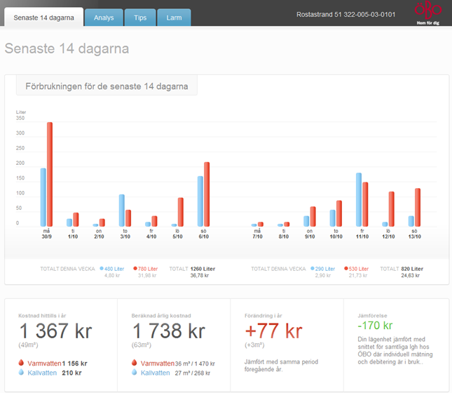 Every month tenants get their invoice where they are able to see their water consumption and the cost. If they want more information or if they would like to check the consumption in detail, they are able to use a web portal. At the web portal they can follow their consumption of water and find more information about how to save water and also get in contact with the housing company’s technician. The service makes it easier to save water and understand how much water they use every day.