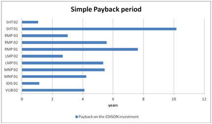 In order to quantify the investment requested to implement the EDISON platform, considering all the aspects above mentioned, a payback plan has been calculated for all the implemented Pilots, taking into account the volume of EDISON components cost designed for each pilot. Figure below shows the payback period for each EDISON implemented pilot that is around 3 to 4 years.