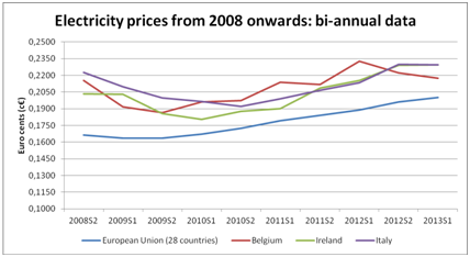This cost item is referred to the operation and maintenance ones, which are reduced for LEDs in comparison to other technologies, thanks to the longer lifetime of the LEDs. Consequently, the need to substitute the burnt-out or damaged lamps is much less frequent. The fluorescent neon tubes in the traditional 4 tube-fixtures require replacement each 24 months due to the continuous use and the expected lifetime (about 7-8000 hours). The lamps are typically replaced upon failure and the yearly replacement cost includes both labor and equipments items. On the contrary, LED fixtures offer a lamp life of about 50,000 hours of use before considering replacement. This extended lifetime means an operative period of more than 13 years, assuming a continuous use of 14 hour-a-day. Furthermore, after 50,000 hours, the lights are not out, but they simply have reduced light output (about 60% of the original output), with the consequence that, in some cases, the LED modules in the fixtures are not replaced before a period of 15 years. In particular, the power supply solution adopted in EDISON, with modules external to the lamps, increases the reliability of the LED lamps. It should be taken into account that these cost items could be optimized considering the annual cost variation of electricity (see Figure below, Source Eurostat) for a reference related to the countries involved in the project), as well as the tendency to lower prices for ICT components and LED lamps (the cost trend is decreasing and the forecast is a reduction of 20% by 2020.