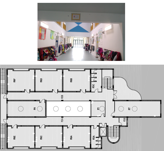 The Primary school of Manoppello is a building structured in two floors. The ground floor is divided in 20 rooms addressed to different activities such as classrooms, refectory, administration office, etc. In the ground floor is also present an outdoor area which includes a courtyard and a technical room. The total surface area that will be involved in the EDISON Pilot at ground floor is 644 m2 wide. The first floor is divided in 14 rooms and, as in the ground floor, they are used for different purposes. The total surface area that will be involved in the EDISON Pilot at first floor is 522 m2 wide.