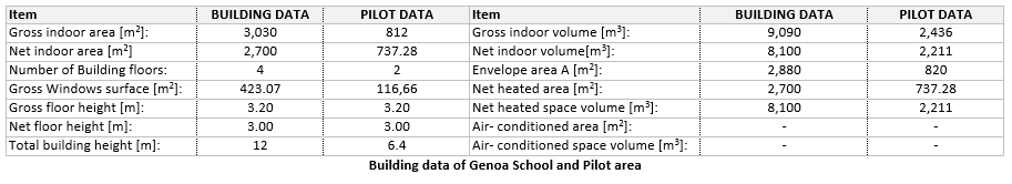 Genoa (Voltri) School is a recent complex school, located in Voltri, West district of Genoa city and built in 1985. It includes three basic school levels: nursery, primary and junior high school and that during the school year hosts an average of 446 people. The complex is accessible from an internal road with some lay-byes and car park areas. The school has a video room, a library, a computer lab, a drawing room, a lot of class rooms, a big cafeteria, a kitchen, a big and well equipped gymnasium and a medical room. It is a two building complex: both the buildings consist of three floors plus the ground floor, for a total volume of about 24,000 m3. The Building proposed for the veryschool project has total area of about 3,030 m2. Pilot area is the first floor and part of the second floor, with a net indoor area of 737 m2. Pilot consist of classrooms, laboratories, offices, library, lobbies, corridors and WC-s. Pilot area hosts approximately 88 people.