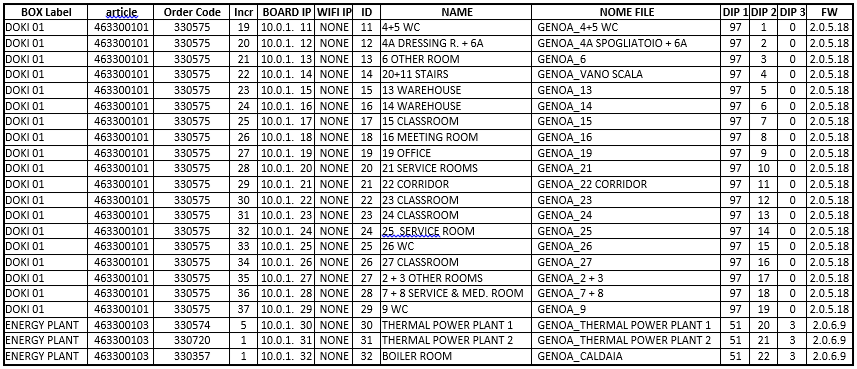 - a table which details for every BOX Module of the pilot the pre-setting settled up in the factory, including the DIP switches presets, the IP address, the ID Genoa BOX code;