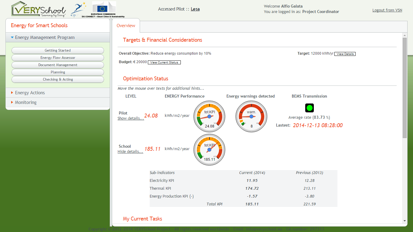 VERYSchool Efficiency is here intended as a process that optimises the Energy Management System, during decisions phases, future planning, current management, correction of the on-going operational program. All these phases always complying with the practices of the ISO 50001 International Standard. Focusing on Pilot activities, VSNavigator and the VERYSchool project as well, has been demonstrated and validated through one year of real-size field tests, measurement and feedbacks for improvements. The entire project helped to promote, guide, disseminate and raise awareness in school organisation, with the new technology, VSNavigator, as focal point to understand how schools currently manage their energy programs, how they identify possible barriers, how they promote opportunities and share best practices. It is to underline that any reference to the school building, or school organization, automatically extends to the general concept of “building” or “organisation”.