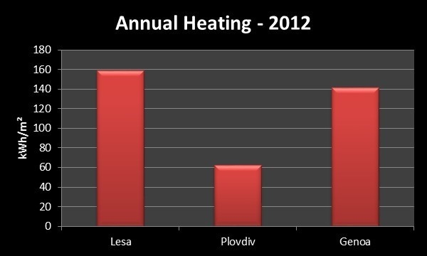 The results of this analysis show that, relative to their respective climatic burden, the buildings located in LESA and Genoa perform equally as effectively. Thus while LESA does consume more heating energy than GENOA this could be attributed to the colder weather conditions rather than it being as a result of poorer building performance. PLOVDIV by contrast shows much better performance than the other two sites relative to its climatic burden.