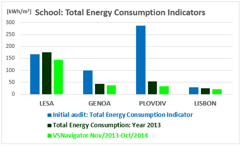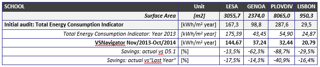 Efficiency is here intended as a process that optimizes the Energy Management System, during decisions phases, future planning, current management, correction of the on-going operational program. All these phases always complying with the practices of the ISO 50001 International Standard. Focusing on Pilot activities, VSNavigator and the VERYSchool project as well, has been demonstrated and validated through one year of real-size field tests, measurement and feedbacks for improvements. The entire project helped to promote, guide, disseminate and raise awareness in school organization, with the new technology, VSNavigator, as focal point to understand how schools currently manage their energy programs, how they identify possible barriers, how they promote opportunities and share best practices. It is to underline that any reference to the school building, or school organization, automatically extends to the general concept of “building” or “organization”.