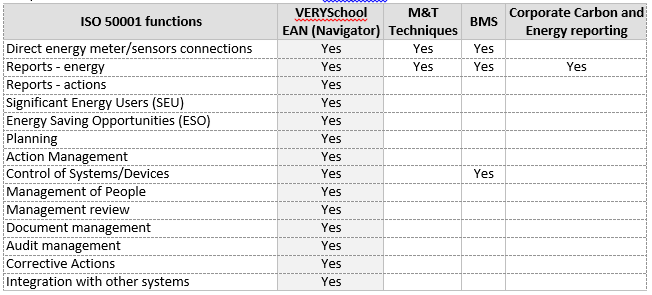 VSNavigator is a product for energy efficiency in school buildings technologically new. This innovative tool provides a quality improvement of existing solutions for Energy Management, since it introduces a repeatable integration of techniques and technologies with Monitoring & Targeting techniques (M&T), utility billing system, (semi-) automated billing entry, (semi-)automated reading entry. Using VSNavigator, Energy Management becomes a systematic methodology that comply with all the requirements of the ISO 50001 international standard. The PDCA cycle (Plan-Do-Check-Act) governs the activities within the Organization, suiting with current management, correction of the on-going operational program, decision-making and future planning. The innovative and high technological level ensured by VSNavigator versus market product and actual compliance with ISO 50001 state-of-the-art solutions is depicted in the table below.