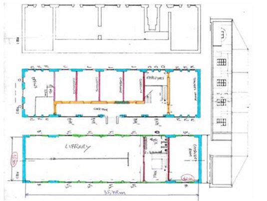 The layout of the initial Pilot area is shown in the figure below. It included four small classrooms and some service rooms located at the first floor, while the first floor hosted a large library and a computer room.