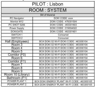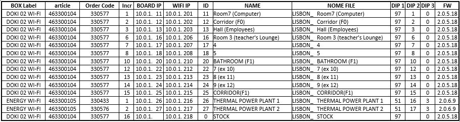 - a table which details the pre-configuration (done in the DOKI laboratory) for every BOX Module, including the DIP switches presets, the IP address, the ID Lisbon BOX code