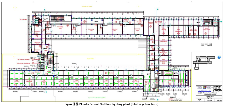 Professional School for Electrotechnics and Electronics (PSEE) is an elite government high school with local significance for the education of young people in the sphere of high education. PSEE has been providing qualified teachers for 40 years. Its professional training is consistent with the requirements of high education standards. Future technicians in electrotechnical Industry, information technology and electronics are prepared in the school. PSEE is a two buildings complex located in West district of Plovdiv, built in 1962 and renovated in 1985. Moreover, the School was refurbished partially, with the change of windows in 2008 (still ongoing action) and the improvement of the heating system in 2012. First buildings has total built area of 1,400 m2, the second one has 1,100 m2. There is a third building bridging the two buildings that has 400 m2 built area. The total built area is 2,900 m2, the total floor area is 8,646 m2, heating volume is 26,388 m2. The PSEE outdoor area is 17,656 m2. During the school year PSEE hosts an average of 939 people. The Pilot area proposed for the VERYSchool project is part of the 3rd floor, with a net indoor area of about 1.600 m2. Pilot consist of classrooms, laboratories, library, corridors and stairs and WC-s. Pilot area hosts approximately 210 people.